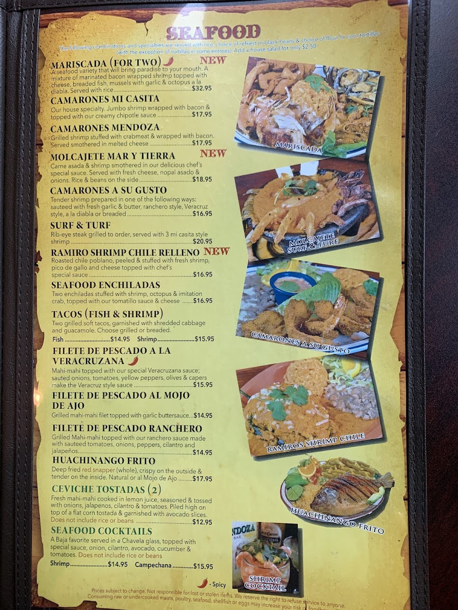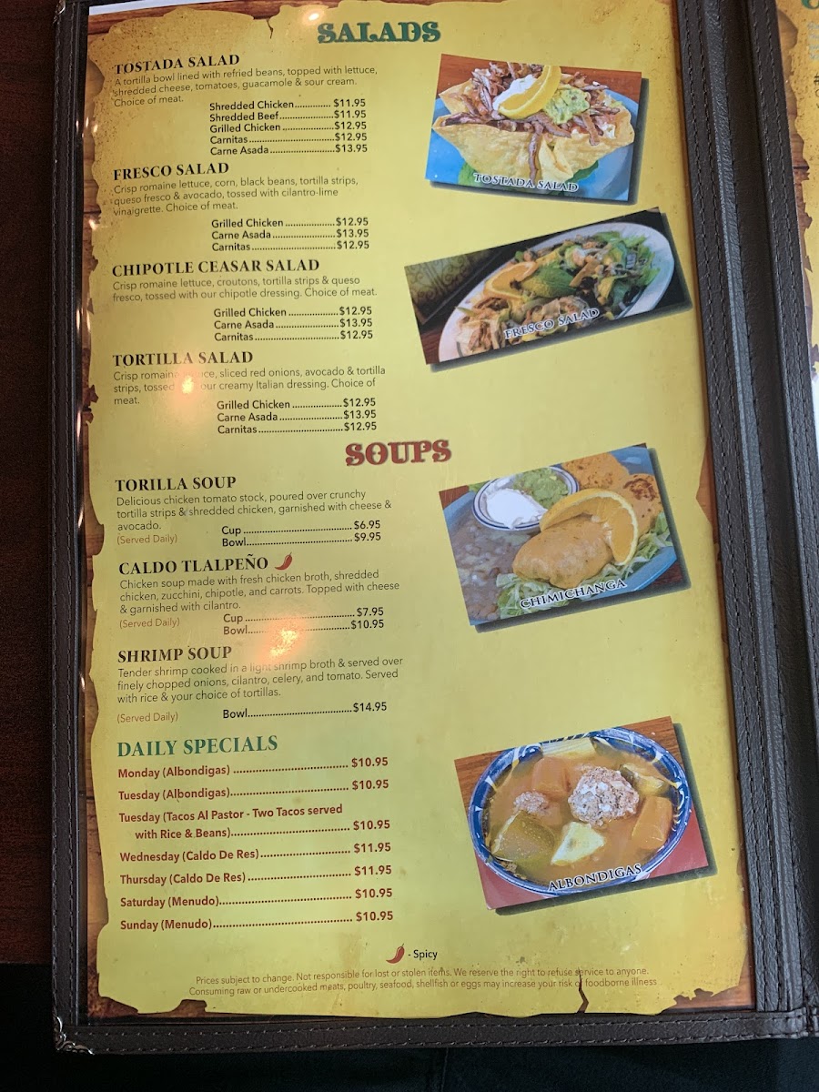 The following entrees are served with rice, choice of refried or black beans & choice of flour or corn tortillas (with the exception of tortillas in some entrees). Add a house salad for only $3.50. Split plate charge is $2.00